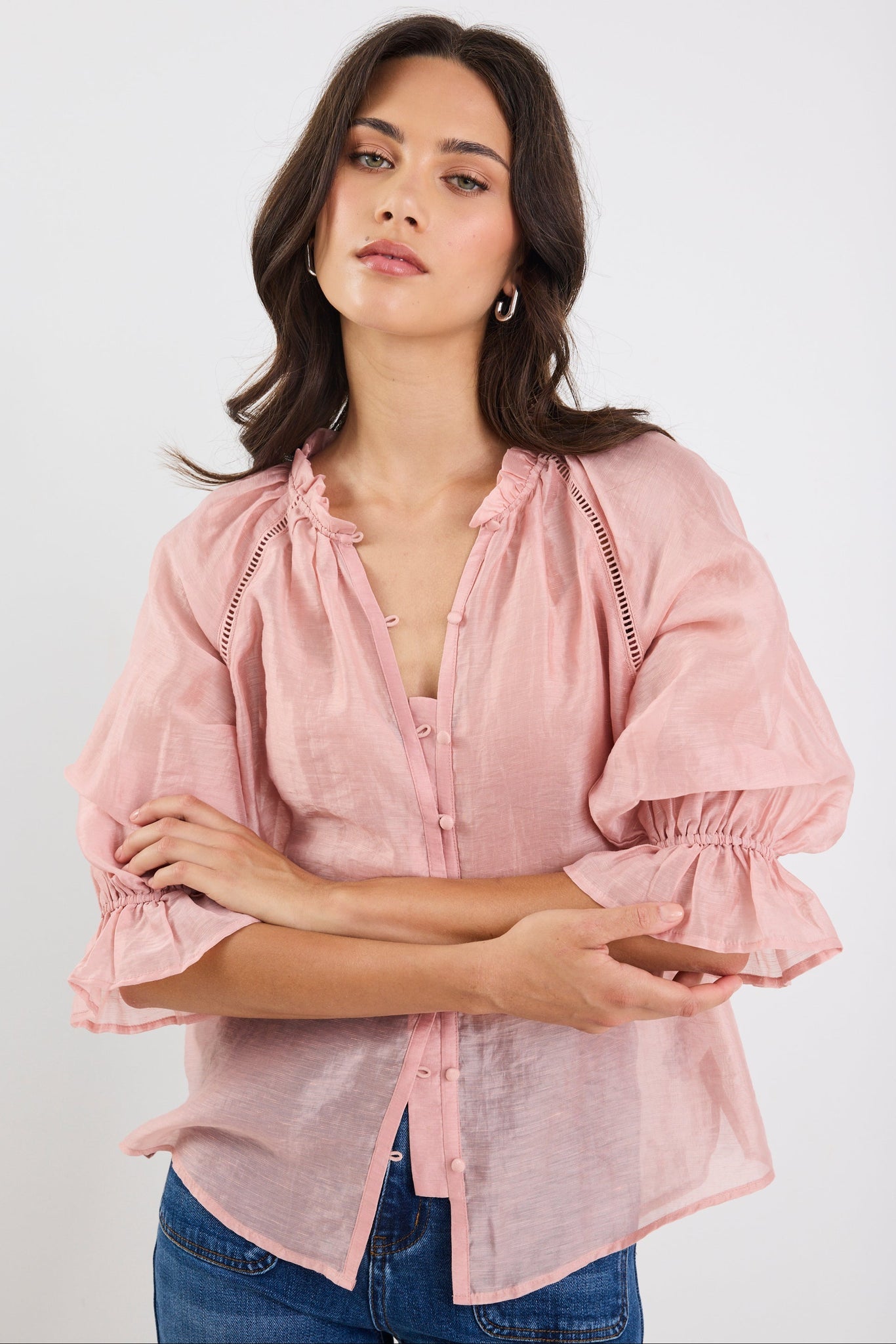 BY ROSA. RESTORATION LINEN BLEND FRONT MID SLEEVE BLOUSE