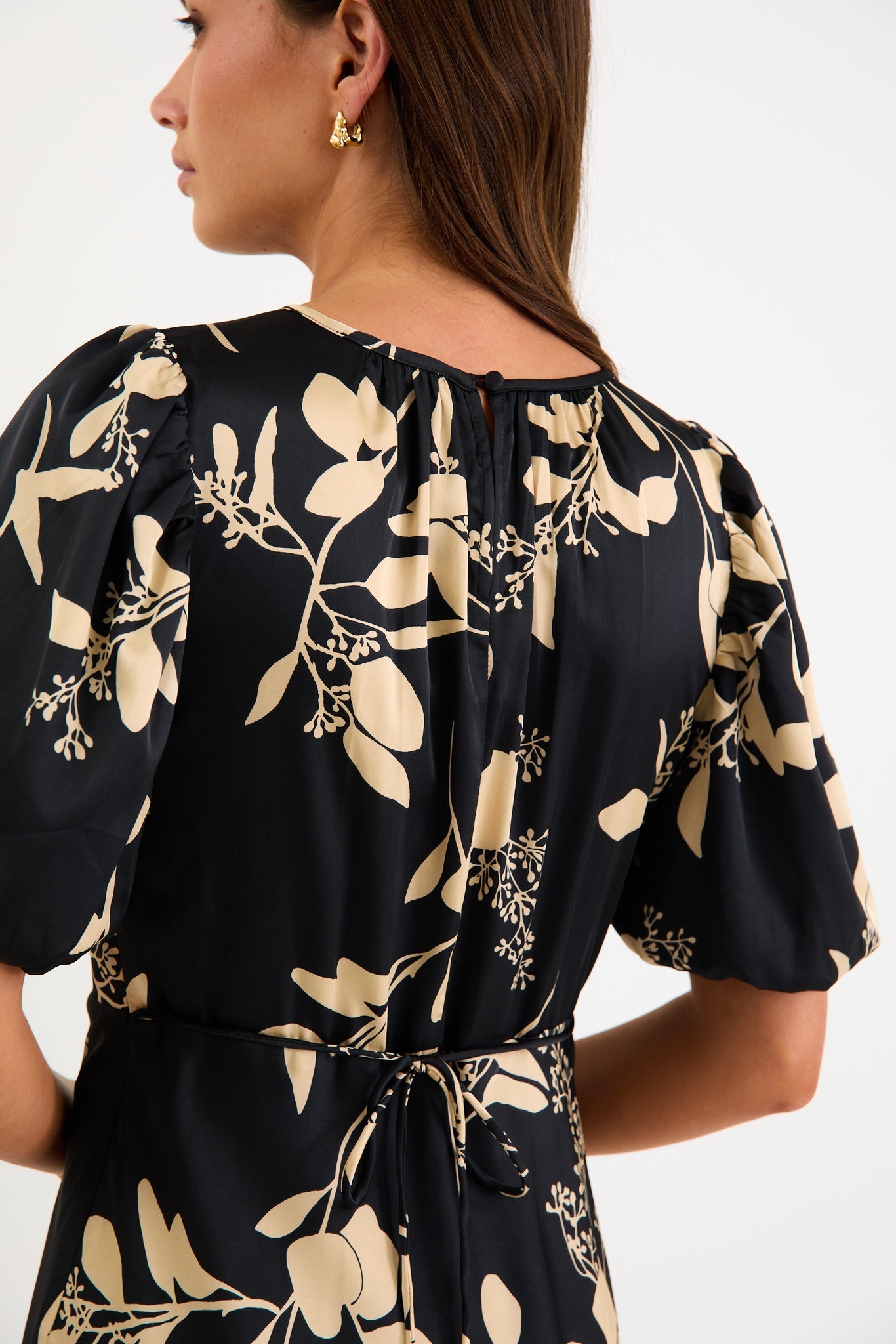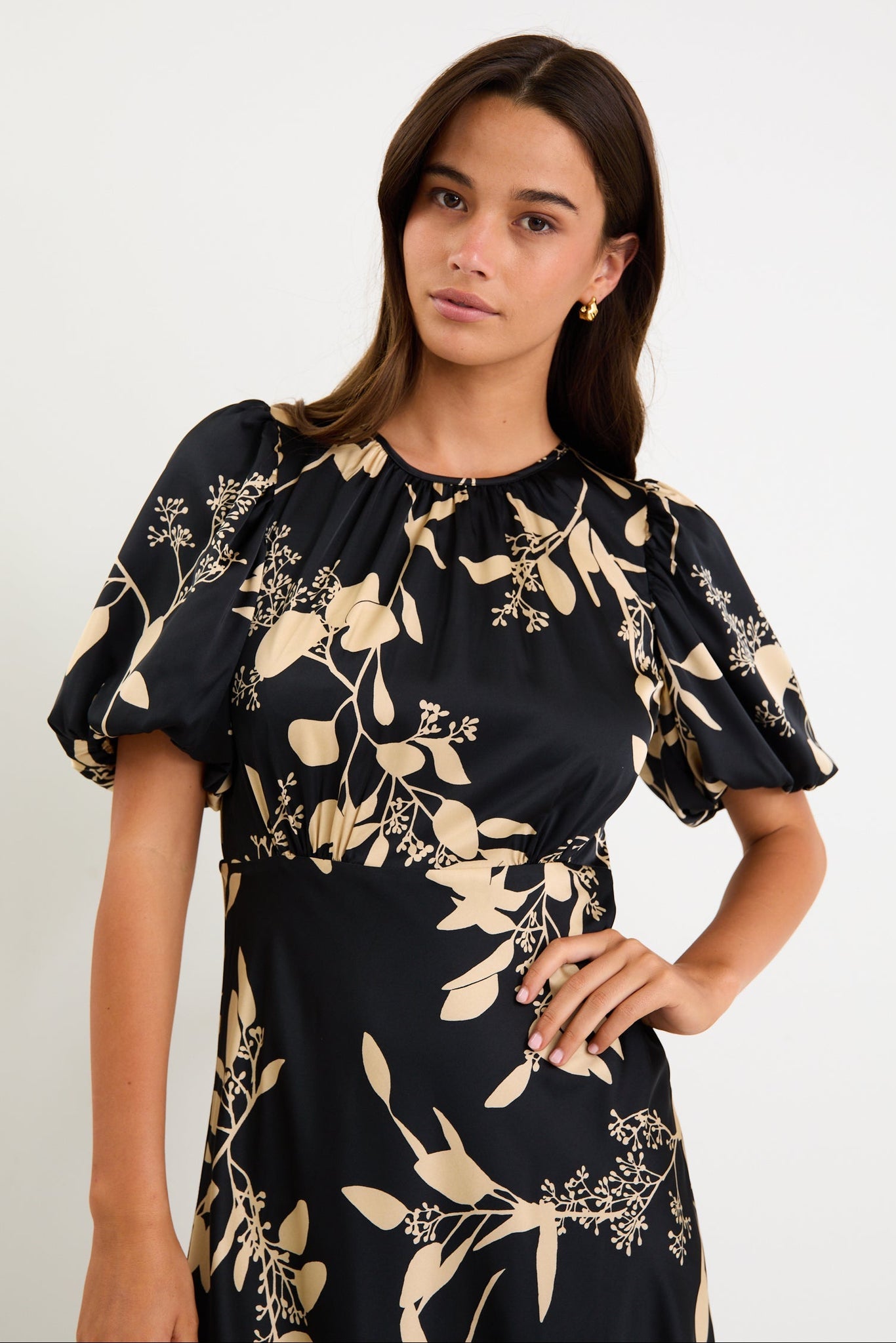 STORIES BE TOLD STAGE BEIGE FLORAL SATIN PUIFF SLEEVE SATIN FLOATY MAXI DRESS